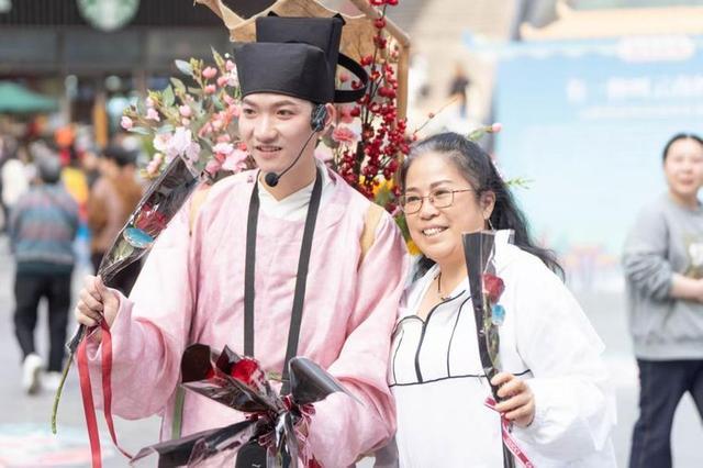 广场中央,身着民俗服饰的舞蹈演员手捧鲜花,微笑着向过往市民送上一支支来自嵩明的玫瑰。短短2个小时,近500支玫瑰带着滇中的芬芳,走进了山城市民的手中、心里。“今天在这里又吃又玩,还收到这么漂亮的花,心情特别好。”家住附近的周女士捧着玫瑰笑着说,“刚才加了嵩明的公众号,夏天准备约几个小姐妹一起过去避暑纳凉。”